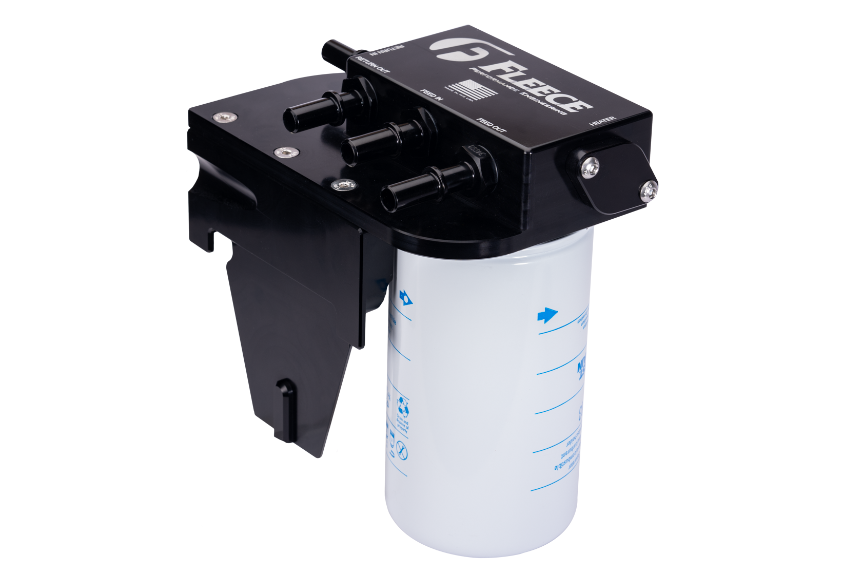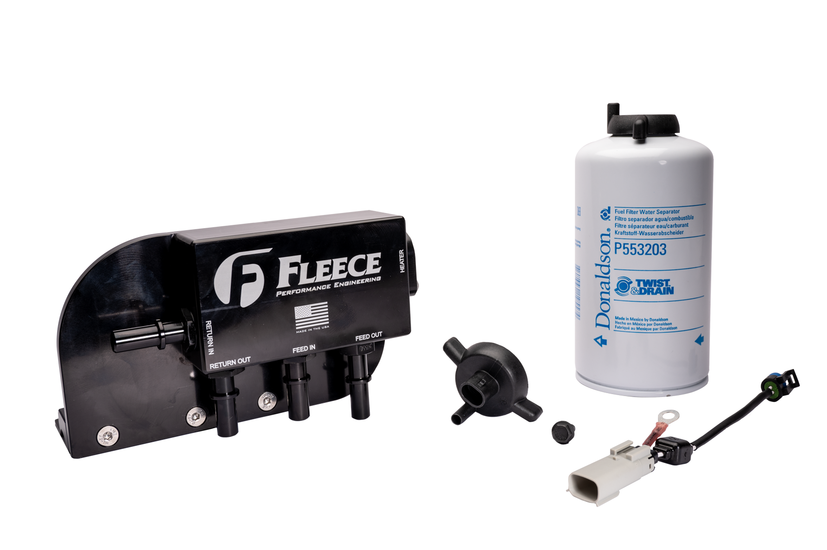 - Fully assembled billet aluminum filter base with Donaldson filter (P/N P553203) and provision for optional fuel heater.